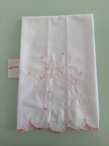 TOALHA DE BATISMO BRANCA E BORDADA A BRANCO E ROSA (35% ALGODÃO +65% POLIESTER)