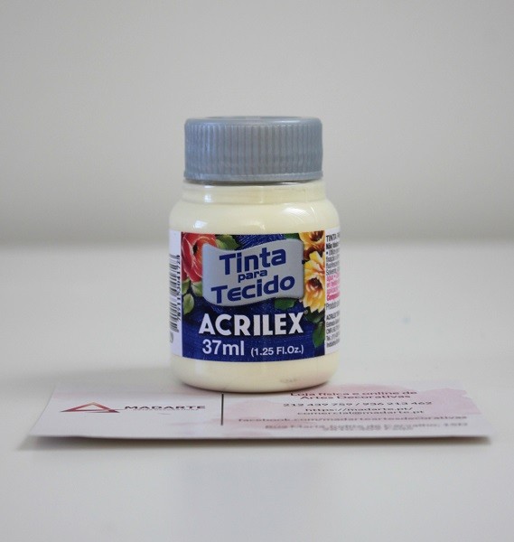 Tinta para tecido Acrilex não tóxica. Muito resistente a lavagens. Pode ser aplicada com pincel, esponja ou carimbo, em tecidos de algodão sem goma, não sintéticos. Lavar o tecido antes da pintura, para retirar os resíduos de goma. Após a pintura, aguarde 72 horas para lavagem.
