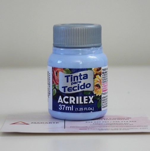 Tinta para tecido Acrilex não tóxica. Muito resistente a lavagens. Pode ser aplicada com pincel, esponja ou carimbo, em tecidos de algodão sem goma, não sintéticos. Lavar o tecido antes da pintura, para retirar os resíduos de goma. Após a pintura, aguarde 72 horas para lavagem.