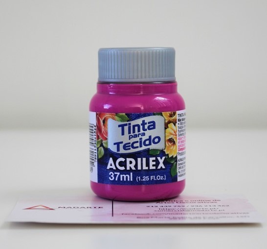 Tinta para tecido Acrilex não tóxica. Muito resistente a lavagens. Pode ser aplicada com pincel, esponja ou carimbo, em tecidos de algodão sem goma, não sintéticos. Lavar o tecido antes da pintura, para retirar os resíduos de goma. Após a pintura, aguarde 72 horas para lavagem.